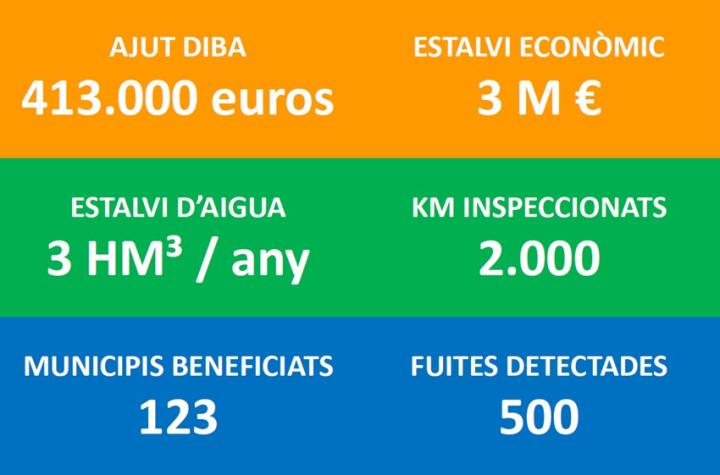 Aquestes actuacions han permès inspeccionar aproximadament 2.000 km de xarxa i identificar més de 500 fuites, amb un estalvi estimat de més de 7.500 m³ d’aigua diaris. Això equival a un estalvi anual de gairebé 3 hm³ d’aigua, que representa gairebé 3 milions d’euros, considerant un cost mitjà de l’aigua d’1 €/m³.