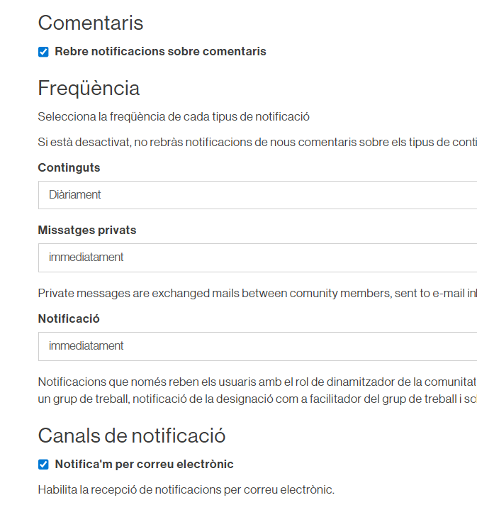A l'apartat de notificacions heu de configurar especialment com i quan voleu rebre missatges que es publiqui a la comunitat.