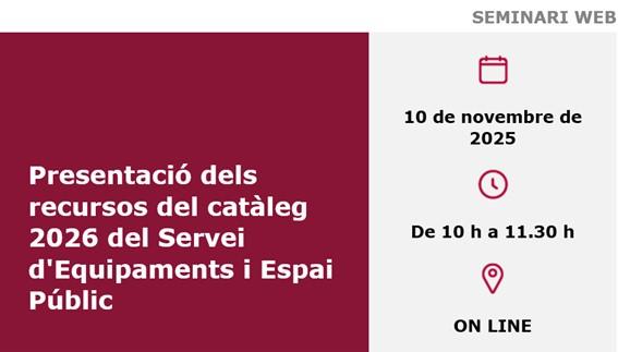 En aquest webinar, s'explicaran els recursos que des del Servei d'Equipaments i Espai Públic es posen a disposició dels ajuntaments i es detallaran tant els seus requisits i característiques com els terminis de cadascun d'ells.